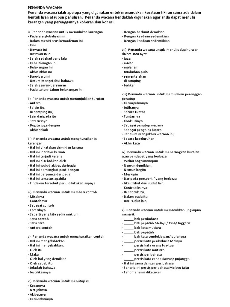 Apr 20, 2011 · penanda wacana i) penanda permulaan karangan a) pada era globalisasi ini, b) pada zaman pascakemerdekaan ini, c) dalam meniti arus kemodenan ini, d) dewasa ini, e) pada masa ini, f) kini, g) dasawarsa ini, h) dalam meniti kehidupan pada marcapada, i) sejak sedekad yang lalu, j) sejak negara menikmati arus kemerdekaan, k) kebelakangan ini, l penanda wacana dalam bahasa inggeris. English teacher at smk batu lapan sik.